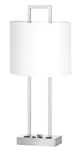 Enhance guest room lighting and convenience with the Prestige Twin Table Lamp with 2 Outlets, designed for modern hospitality environments. Featuring a brushed nickel finish, dual vertical supports, and a white linen drum shade, this lamp delivers a refined, upscale look ideal for contemporary and higher-end hotel interiors.
