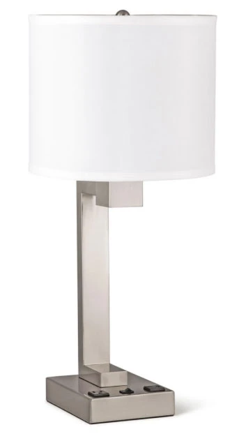 Add modern style and guest convenience to your rooms with the Strata Single Table Lamp with 2 Outlets, designed for hospitality environments. Featuring a brushed nickel finish, a clean rectangular base, and a white linen drum shade, this lamp offers a contemporary look that works well in a wide range of hotel interiors.